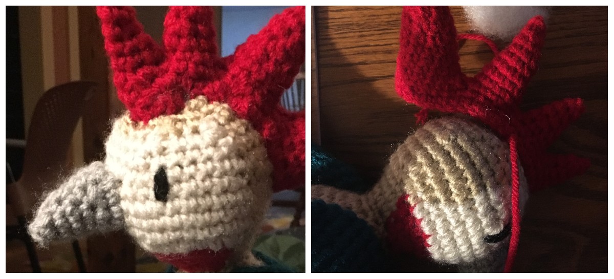 The beak was one of the quickest pieces to stitch up, but had me rethinking my yarn choice again. This is the point when we all began to assemble our birds, prior to adding the final feathery finesse. Kerry herself is a late stuffer. Preferring to finish up the crocheting, and stuff everything immediately prior to stitching a piece together. I personally am an on-the-go stuffer, and like to add the stuffing as I’m crocheting a piece. I usually begin stuffing shortly after starting a decrease. I find this to be easier to do than waiting till I have a six stitch hole to stuff all that stuffing into. Much like Thanksgiving, placement of the stuffing is a personal matter.