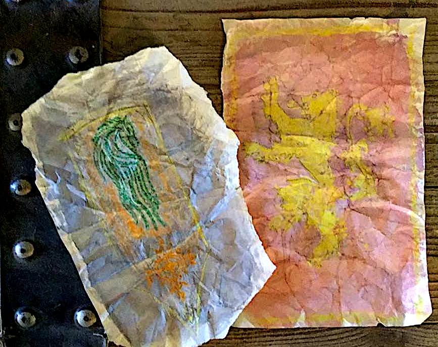 To give it that antiqued, “batik” look use plain watercolor paints, and paint over the entire image. The paint won’t stick to the waxy surfaces but will blend in with the paper.