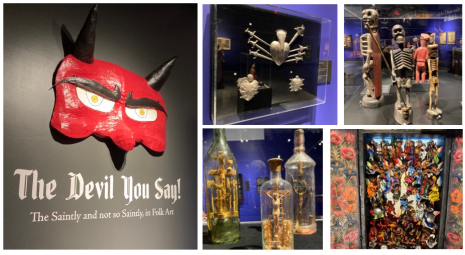 There were masks, retablos (sculptures of religious iconography), artifacts, paintings, and a variety of mixed media work, all depicting the sinners and saints, devils and angels associated with both Christian theology and popular folklore from North and South America. They blended Indigenous and European beliefs as well. Subject matter aside, the impressive diversity of pieces in this one exhibit focusing on one particular subject showed how artistic, creative thinking has always been hardwired into the human experience.