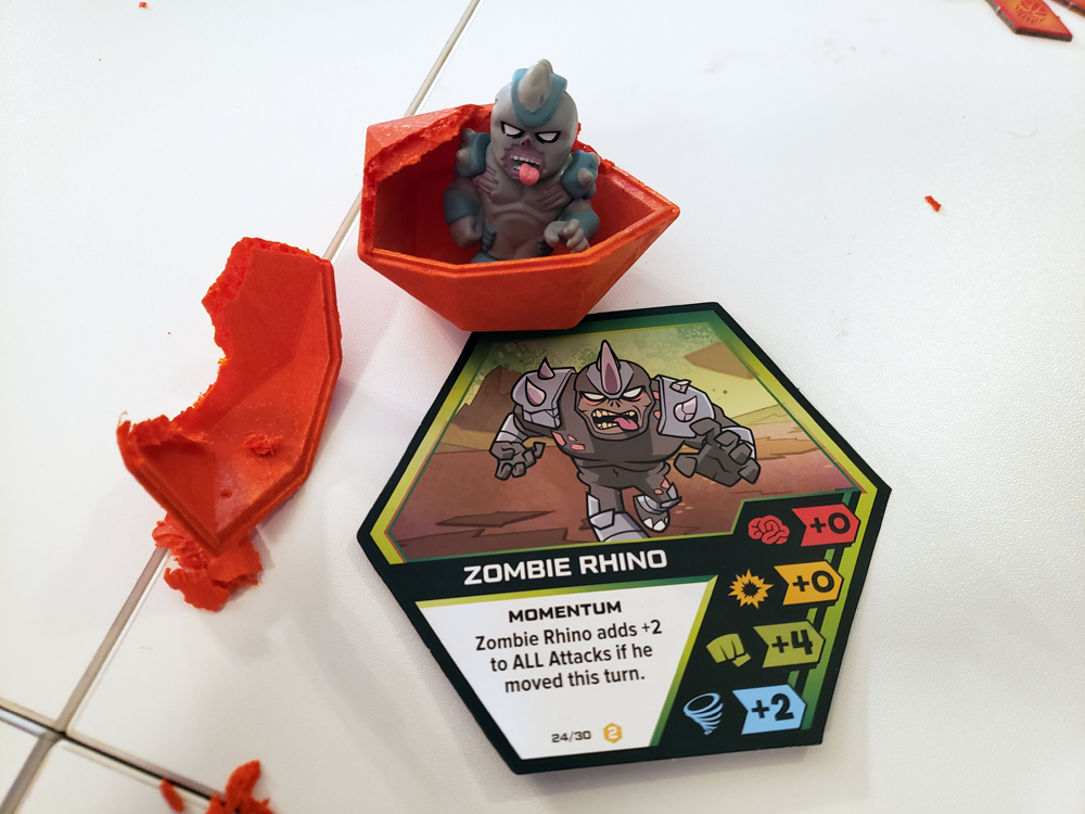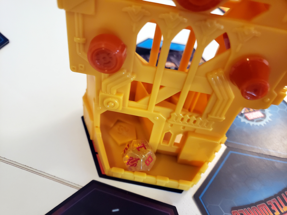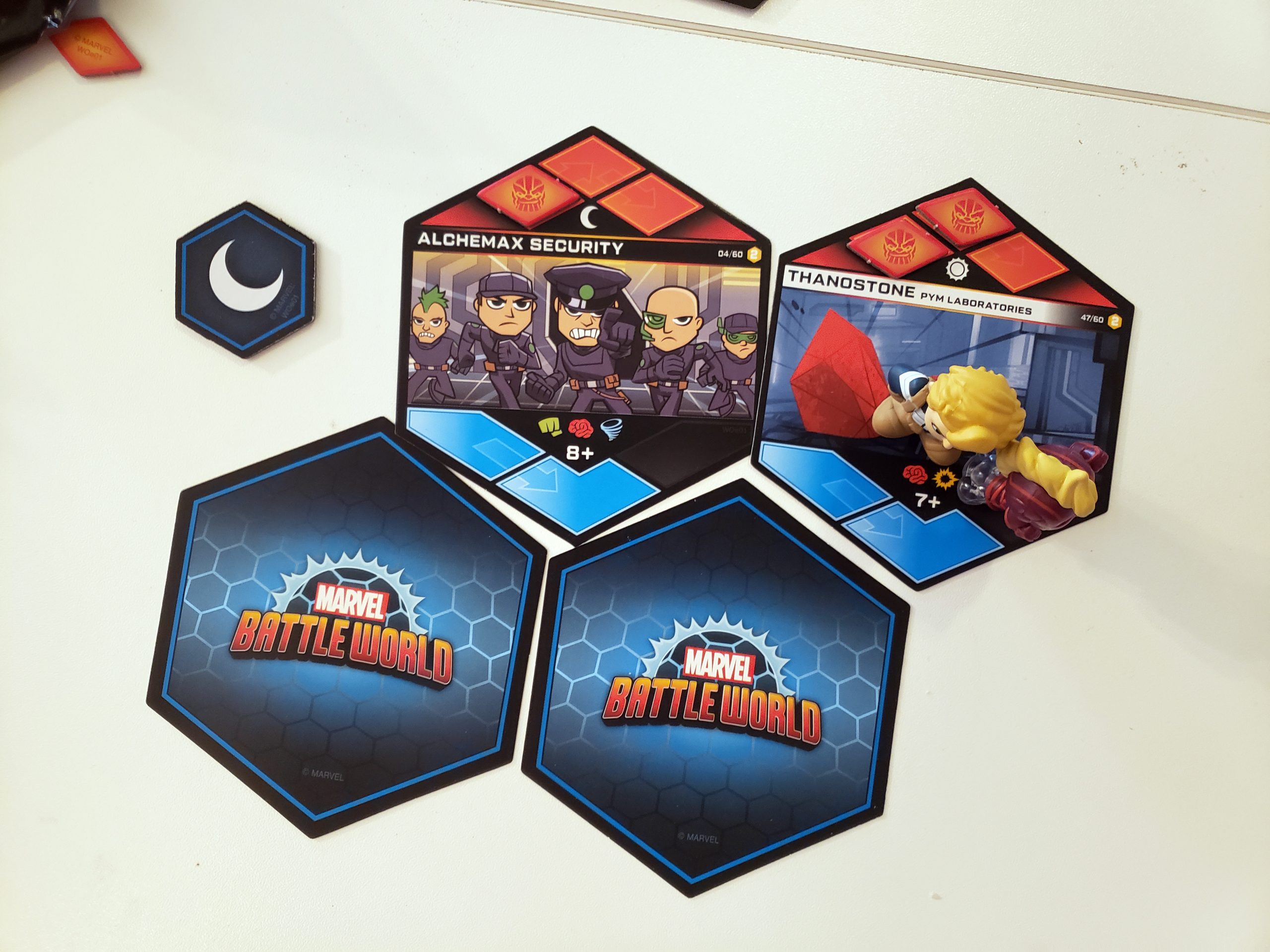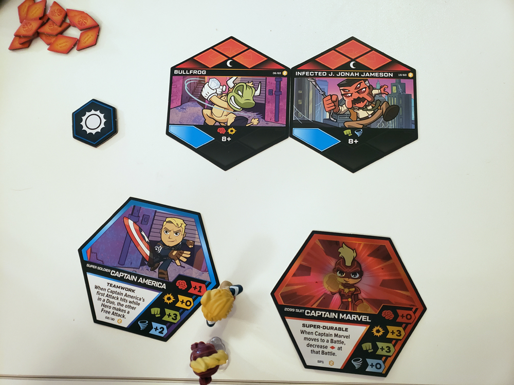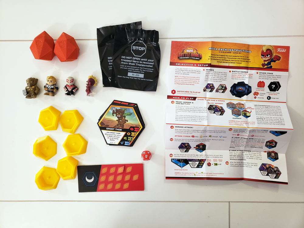 Overall, I really like the pieces. The Hero Movers are bright, colorful, and clearly easy to differentiate from each other. They can be popped into the Hero Stands, which also have a slot for the Hero Cards, but we found the Hero Stands really aren’t necessary to use at all. The double-sided cards are playing card thickness with fun artwork, easy-to-read stats, and the hexagon shape is really nice for putting the battlefield together. The Thanostones are a fun one-time use thing. They need to be cracked like a certain stubborn egg and revealing the Mystery Hero is a lot of fun, although some may be disappointed that they are one-time use items. I do like that the Thanostones have a number on the bottom that matches a Mystery Card, so you can keep the mystery until the big reveal. The Danger Tokens and Danger Coin are thick cardboard, but easy to read and sturdy enough for the purpose they have in the game. The attack die is your basic 12-sided die with some custom symbols, but it’s easy to read and works well. The price point and component quality point are just about what I would expect, and this set contains everything you need to play a 1-4 person game.