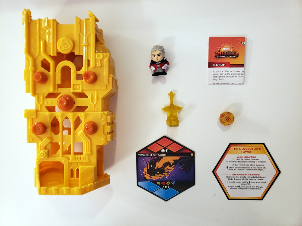 My seven-year-old liked this expansion set the best. The cards and figures are similar to what I have described before, but the Twilight Sword Die is extra shiny and cool, and the Stand with the Twilight Sword snaps nicely onto a Hero Mover and looks so cool to my kids clearly coveted it. The Collector’s Tower is effectively a tall plastic dice tower that has a series of knobs that can impact the dice roll. Areas of the tower are clearly marked and adding them to the game was a lot of fun. Like the Talon Fighter, it’s a pretty nicely done set.