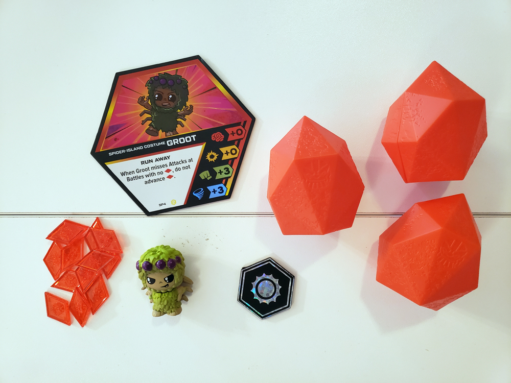 The pieces for this little expansion are a little different but include some of my favorites. For durability, I like that the Premium Pieces here are made from plastic instead of cardboard. Because of said preference, we found ourselves using the premium pieces whenever possible. The Spider Island Groot is a fun little exclusive character that we have found quite useful in gameplay. I also love the reusable Thanostones because it lets us blindly grab a new Hero to add and recreates the fun of the reveal all over again. I would happily pay for another premium pieces pack to get the additional Thanostones, especially if there was another exclusive character variation.