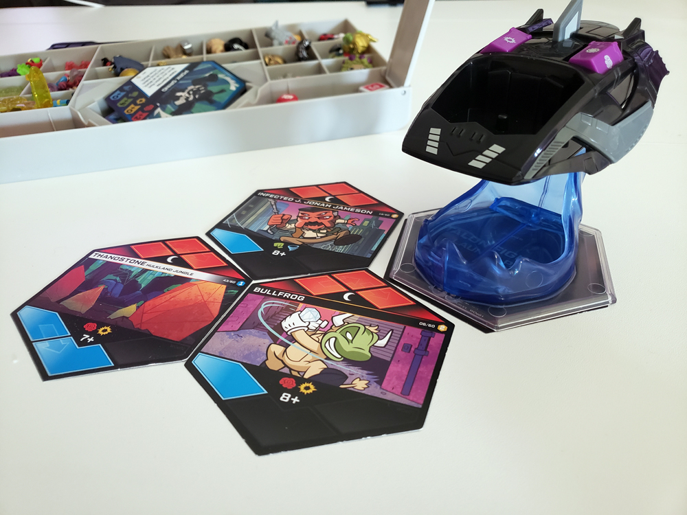 Maybe it’s the mom in me, but this might have been my favorite add-on. The Hero Mover and Card are just like the others but the figure is exclusive to the Storage box. However, the Storage Box itself is really nice. It boasts the ability to hold up to 50 Hero Movers as well as Cards and other pieces. Between all the little compartments it was easy to have a place to keep the smaller pieces and we can separate the Hero Cards and Battle Cards to make game set-up faster and easier. The reusable Thanostones also fit in as well as all the instructions. The only items we can’t get in the box are the Talon Fighter and the Collector’s Tower. The Storage Box has solid and secure clips at the sides and is just a really nice accessory to have once you’ve managed to gather a decent-sized collection.