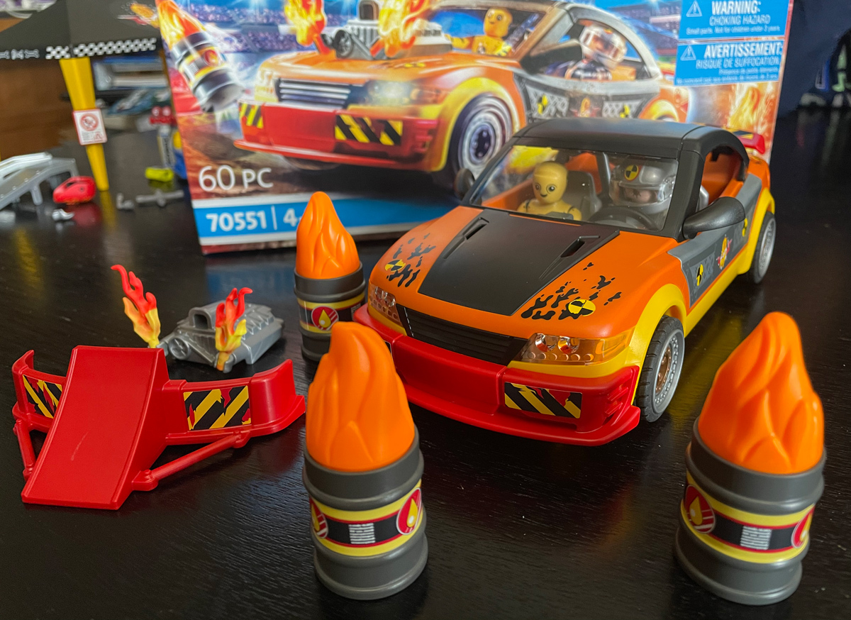 The Monster Truck was the hardest of these three sets to build, mostly because of the suspension system on the bottom of the truck which was a little tricky and required more than usual force for a Playmobil build. That being said, on a scale of 1–5, it was about a 3. The Crash Car and Service Tent were both easier, at about a 2 and 1.5, respectively. Neither of these sets had anything particularly difficult to call out, though the Service Tent does have a few long skinny stickers which always seem to be a little more challenging for the kids to get on straight enough for them to be happy with the results.