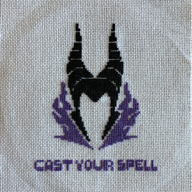 I asked my favorite Disney Villain fan (my partner, GeekDad Rory) what he’d like me to make for him. He choose one of the Maleficent patterns. Since that pattern required materials that weren’t part of the kit, I dug through my own Aida stash, but only found a much-smaller grid size for the necessary color, with twice as many stitches per inch. So, I used the much-smaller Aida fabric. (Fortunately, the pattern used some of the included embroidery floss colors.) And, deviating a bit from the book’s plan, I used one strand of embroidery floss instead of two because of the smaller grid. I admit that I did have to take off my glasses so I could see what I was doing close-up. Fortunately, middle age hasn’t yet stolen my close-up vision.