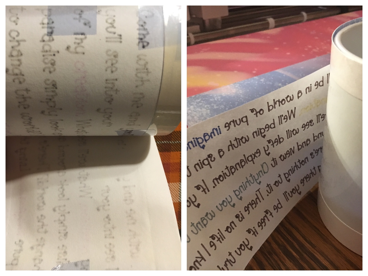 It was a silly amount of fun to switch out pens for each word. Though they didn’t switch out in the order I had anticipated, so my color sequence went a bit off. “Pro”-tip: the sequence follows the order you changed the world in Design Space, not the order the word appears in the sentence. Wonder of wonders, given that this was an entirely text project, I remembered to turn mirror image on.