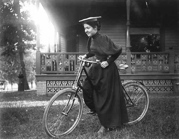 “The woman who put on divided skirts and took to the road on her ‘safety’ gained not only independence but a measure of health and a sense of well-being that her neurasthenic sister of earlier decades might have envied,” says Patricia Marks in her book Bicycles, Bangs, and Bloomers: The New Woman in Popular Press. She goes on to say, “…the woman on a bicycle represents both activity and options; the woman on wheels may decide where she wishes to go and what she plans to do when she gets there, regardless of a male companion, or lack of one. Her influence upon the world is more immediate; no longer confined to the home or hoping to escape from the vicissitudes of earning a living, she actively seeks new experience and intends to have some impact on the world around her.”