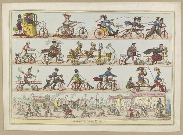 Throughout history, people have desired to propel themselves in ways above and beyond their own two feet. Perhaps the most notable ancient example of this is the myth of Icarus and Daedalus, who built wings so they could fly under the power of their own arms. Though the technology of the wheel and wheeled vehicles came about long ago, with some evidence pointing to the use of such things in ancient Mesopotamia in 3500 BCE, it wasn’t until the very late 18th century that even a rudimentary vehicle propelled by a man himself was made viable. This contraption, called a velocipede or hobby horse, consisted of a board between two wheels with a seat in the middle. The wheels were shod with metal, more like wagon wheels of the time than the rubber tires we’re used to today. A person would push off the ground with his feet, alternating between them, and propel himself forward, almost like running. There were no brakes, and there was no steering mechanism. The driver could only lean side to side to change direction. Many men enjoyed using them in England and France, even using them in races, though their popularity was limited by people hurting themselves trying to lift the heavy machines, even to the point of rupturing their groins. These vehicles were dangerous to ride, as well, and accidents happened regularly.