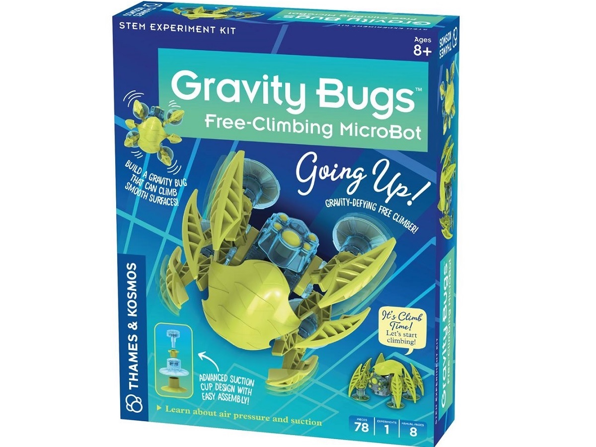 Gravity Bugs feature third-generation wall-walking technology with advanced suction-cup design and are designed for ages 8 and up. Children 8–11 new to this type of product may need the help of an adult or older child for using cutting tools to prepare parts for assembly. The Gravity Bugs Free-Climbing MicroBot sells for $19.95 and can be purchased from Target. It can also be purchased directly from Thames & Kosmos.
