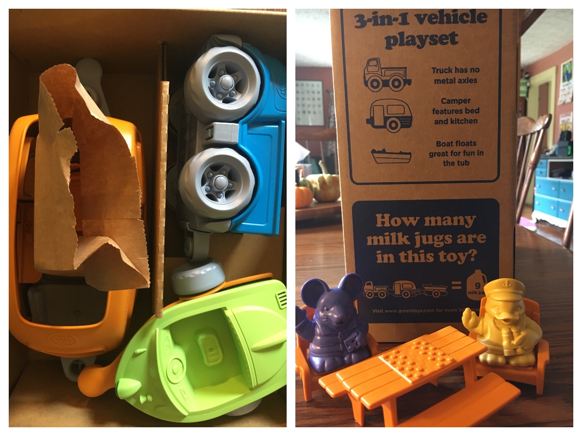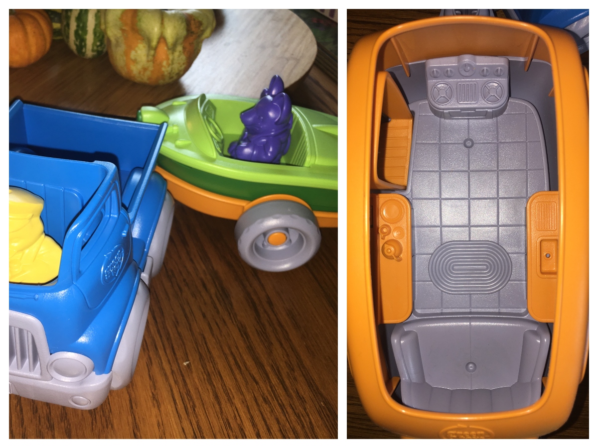 This year my family took our first RV trip into New Hampshire’s White Mountains, and so of course we had to get the new RV Camper Set from Green Toys. We like things, I warned you, it’s what we do. There are three big components to this new set, a small truck, a camper, and a boat trailer with detachable boat. We are not boat people, just RV people, but this is fun too. Inside the completely recycled packaging is the completely recycled toy. Inside the completely recycled toy, is a completely recycled paper bag containing the small recycled pieces of the recycled toy; the picnic table, some chairs, a camping mouse and a camping duck. It is utterly delightful, and everything I’ve come to expect from this company I’ve known since I was a brand new mom worried about my baby licking things. I don’t worry anymore, they all lick everything.