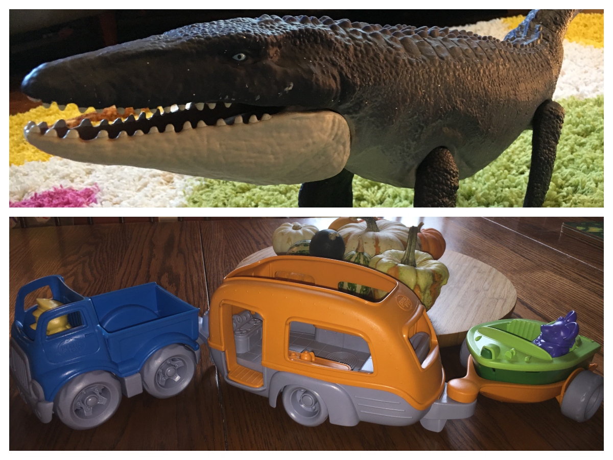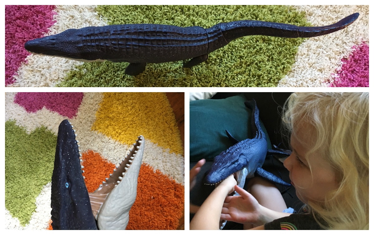 Material aside, the toy itself is super fun, and the perfect fit for that kid who is in middle school, and past the age for which Green Toys are aimed. Not yet a teenager but not quite a kid, the Mosasaurus is a great toy to play with. My twelve year old son had a ball putting this together, and as an avid fan of the movies and cartoon has really enjoyed playing with this. Video games have not yet completely taken over his gift receiving experience, for which I am thankful but I am always looking for big box things for him for under the tree, to compete with the toys in giant boxes that his younger siblings still get. If you are still shopping for that in between kid then this is a great option, and again, for all kids, I would have adored receiving this as a child. Half the time, his sister is stealing this to play with, though thankfully it has not yet made its way to our bathtub.