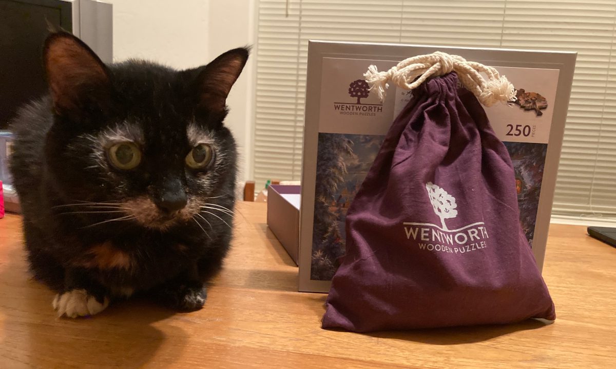 The wood used in Wentworth’s puzzles has been sourced from sustainably managed forests, and they don’t use plastic in the packaging process. Each cardboard box is very sturdy, and the puzzles pieces are stored in a cloth bag inside. When you first open the puzzle and bag, the puzzles smell strongly of wood and manufacturing smells, but airing the pieces out for a while quickly gets rid of the smell, and odor should be minimal from there on out. Still, if you’re sensitive to the smell, I found that running a ceiling fan really helps.