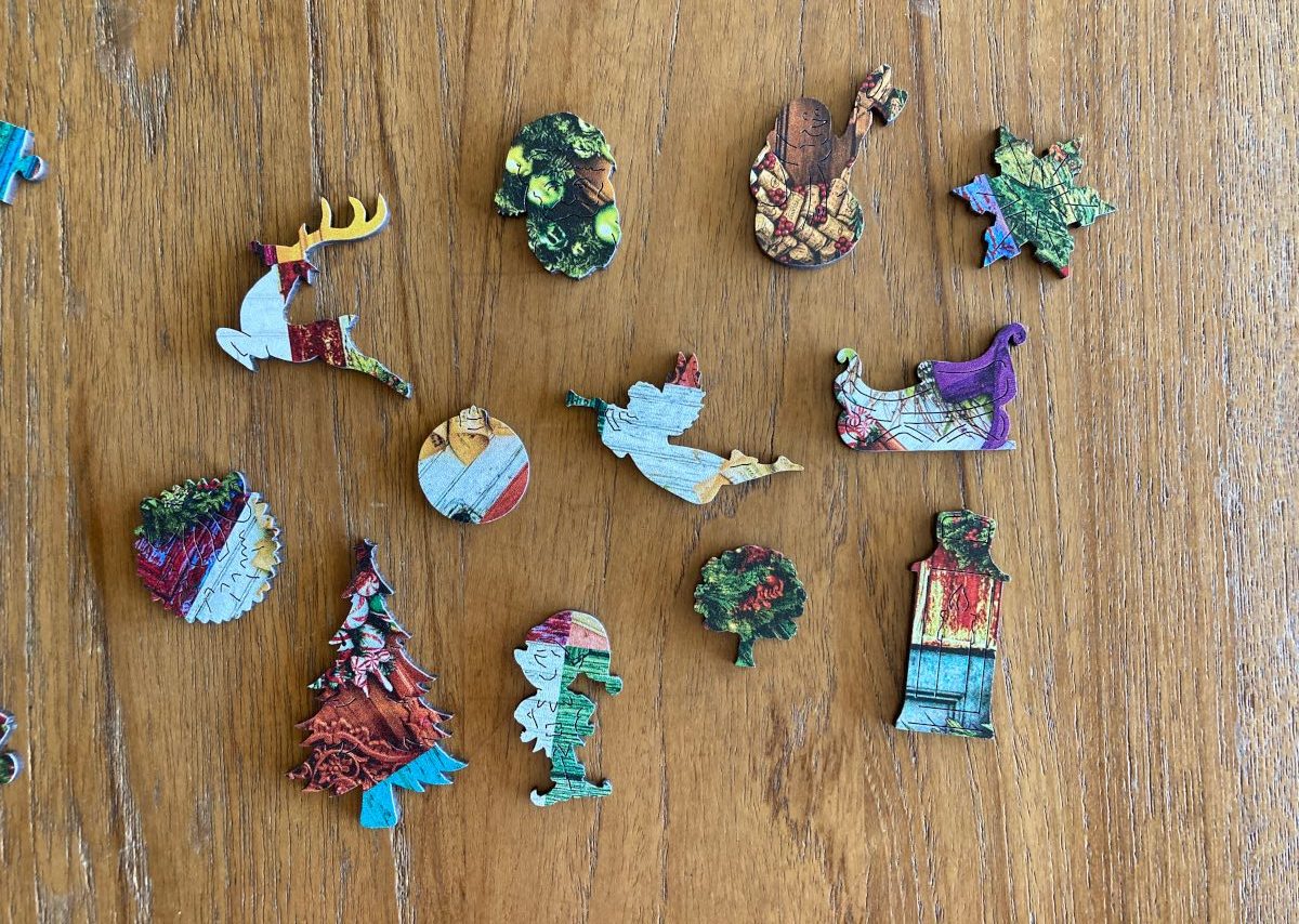 The best parts of Wentworth’s puzzles are the special pieces hidden amongst the more jigsaw-y pieces. Even though the puzzles are made with very challenging irregular pieces, these additional “whimsy” pieces really make the puzzle special, and each puzzle has some that relate directly to the theme of the puzzle. For example, a puzzle based on Park Avenue in New York City has the Statue of Liberty. And a calm, meditative puzzle includes someone sitting with their legs crossed. A garden-based puzzle has a spade and some vegetables. And, for their new holiday collection, the special pieces include things like snowflakes, Santa Claus, presents, ornaments, reindeer, winter birds, candles, and more. Some of the whimsy pieces spell out messages, like “Happy Holidays” and the like. The whimsy pieces also have additional texture carved into them. Note that the puzzles with more pieces also have more whimsy pieces.