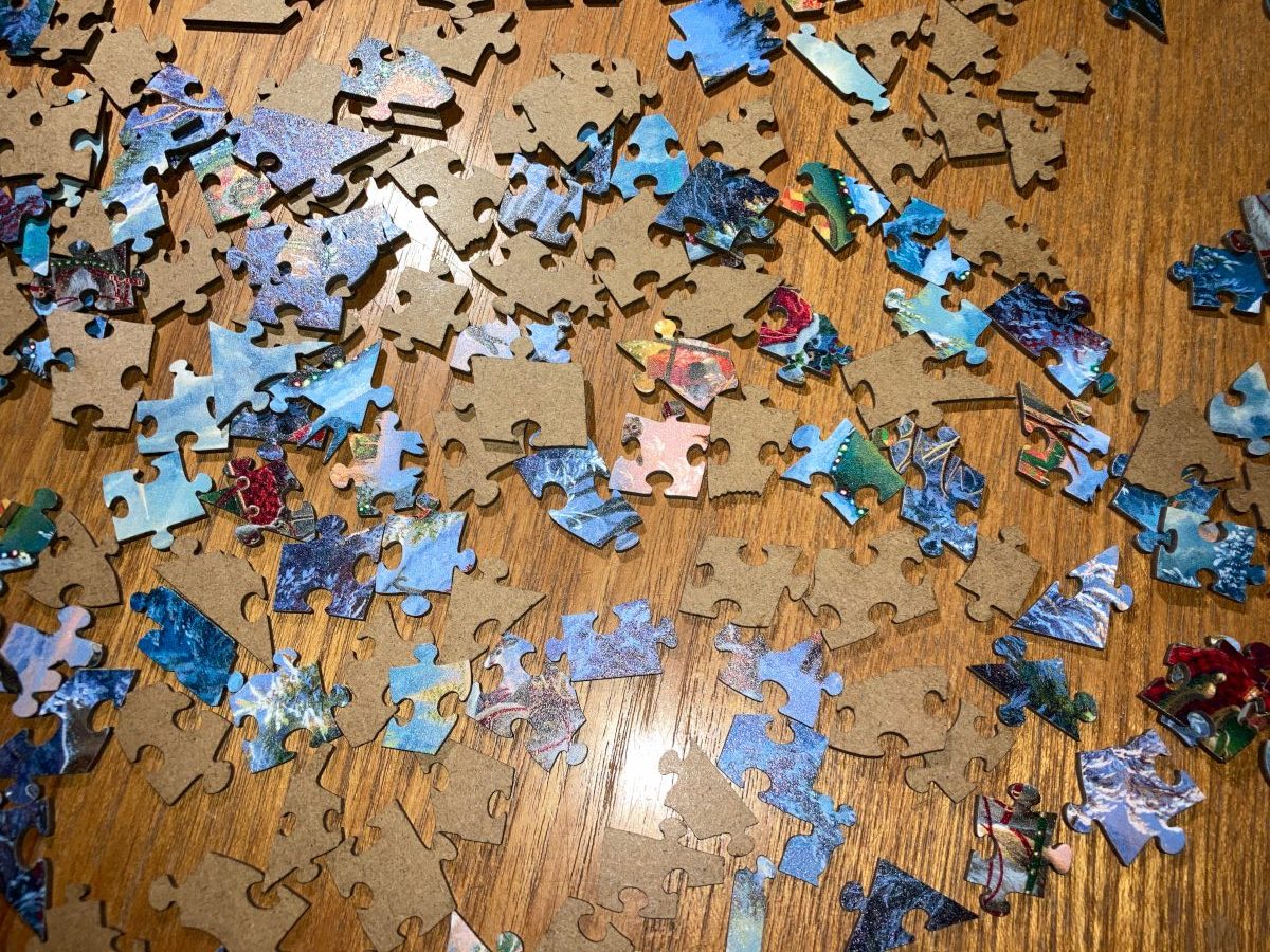Strategy spoiler alert: Unlike conventional cardboard puzzles where most pieces follow a similar general shape, even the non-whimsy pieces in these puzzles can fool you. The normal strategy of collecting and connecting the edge pieces first is an exercise in partial futility here, since not everything that connects the border together is obvious; it’s better to just work on notable image sections and let the edge develop secondarily. Often pieces that appear to be edge pieces really aren’t!