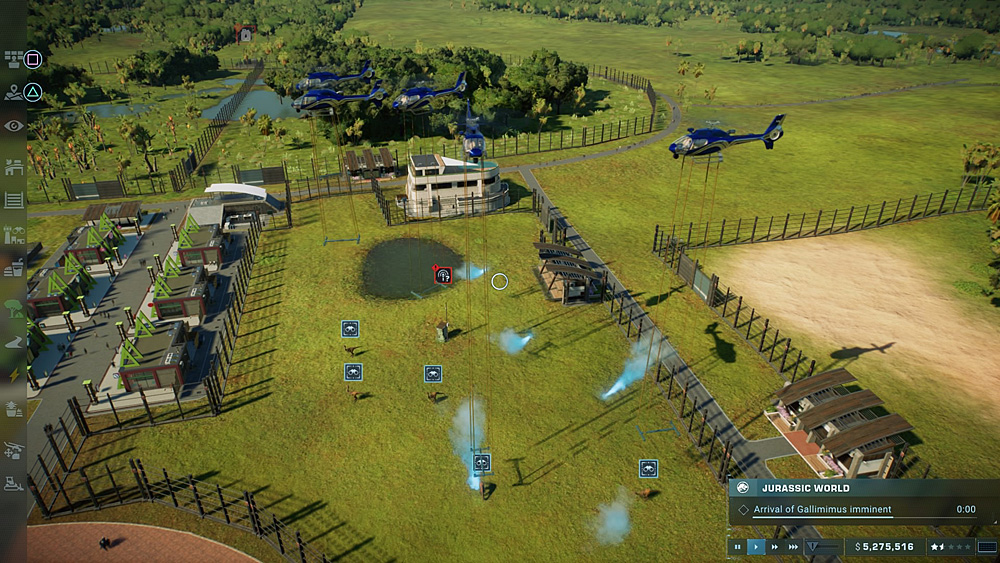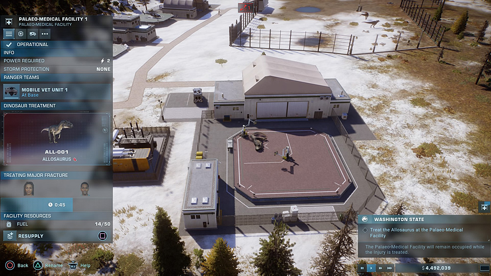 One thing I particularly liked about this new edition of the game is that it seems to have a stronger focus on the welfare of the dinosaurs. A Paleo-Medical facility is available with a veterinary team on standby to head into the field and perform scans or bring in injured dinosaurs for more invasive medical procedures. I also appreciated the ranger stations. These small items can be placed into each paddock and assigned to a ranger team who will then regularly visit and perform status checks on the dinosaurs nearby, assessing their happiness, health, and general wellbeing. This makes it much faster to spot unhappy dinos before they start causing carnage. A dinosaur that hasn’t been checked for a while will have a small symbol showing binoculars pop up above them, and you can manually assign a ranger team to check in on them.