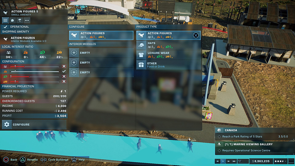 Many of the buildings are highly customizable with hundreds of combinations available between overall building style, roofs, entrances, and decorations—and that’s before we even get to choose between practically infinite color options! Check out this short video on my YouTube channel to get an idea of how much variety there is to choose from. The interiors are also customizable, although that’s where I found my biggest difficulty across JWE2 gameplay. Each amenity building (that’s food, drinks, and shopping) will show a Local Interest Ratio split across four areas: blue, red, green, and gold. For example, the shop I am looking at as I type this shows 36% blue, 0% red, 44% green, and 19% gold, but these numbers will constantly adjust up and down. You can then configure your shop by choosing from different product types that will adjust the configuration bars below these numbers. Adding in extra Interior Modules such as a fish tank, sunglasses stand, fossil display, or fountain will further adjust the bars. However, at no point has the game ever explained what these bars are, what the colors relate to (the red appears to show a flame, the green might be a planet, and the gold is a crown), or how important any of this is. This has left me wildly guessing or otherwise ignoring it altogether because there is almost always a more pressing concern happening elsewhere in the park.