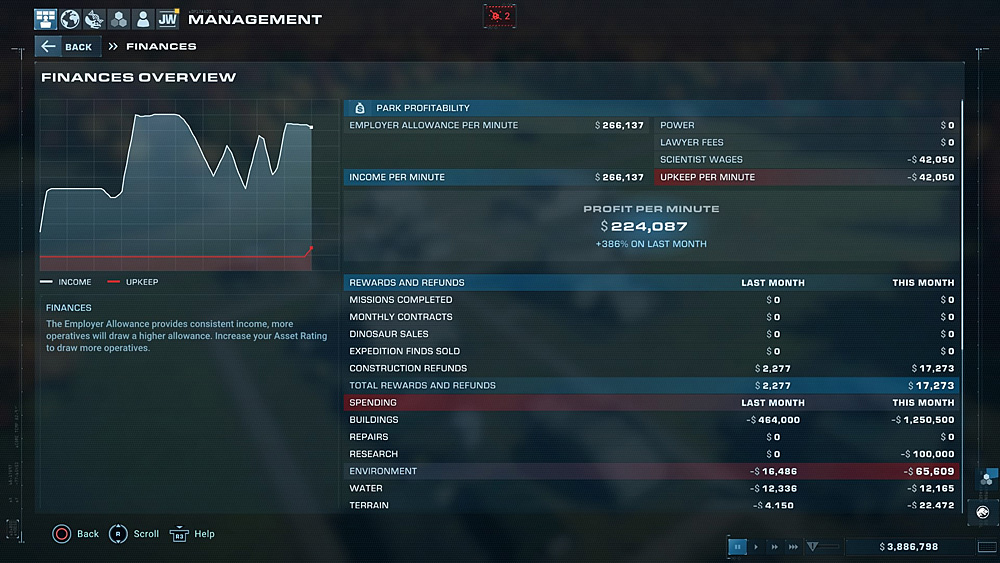 JWE2 also fixes several issues from the previous game. The first game’s obsession over contracts was a constant thorn in my side—you had to keep a constant watch on your reputation, making sure you weren’t favoring one department’s contracts over the other two or else you risked sabotage in your parks (the Park Security department deliberately sabotaging the gates on the velociraptor paddock never did make much sense). JWE2 does keep the monthly contracts, at least in some game modes, but they no longer have the same huge impacts within the game and are more of a fun addition now than a bugbear. The ability to immediately airlift newly hatched dinos from the hatchery is an enormous improvement that makes it much easier to design pleasing parks.