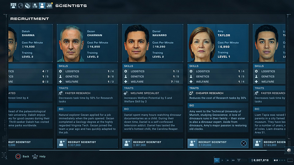 One of the most noticeable differences between JWE2 and its predecessor is staffing. In the original JWE game, staffing was largely automatic. If you added an Expedition Centre, you gained a Dig Team to go out and collect your fossils. Then, when they returned with their discoveries, another team extracted the DNA while the Research Team researched new additions for the park. In JWE2 you’ll have to manage a pool of individual staff members. Building Staff Centers will allow you to recruit new scientists from an ever-changing and diverse pool (you can also fire existing staff to free up space), but be careful who you choose. Each staff member will have a skill level across Logistics, Genetics, and Welfare, and you’ll need to consider these when hiring. Tasks such as researching a new building or conducting an expedition will have a requirement across the three skill sets, and if you don’t have scientists with high enough skills, you won’t be able to complete that task. The scientists also come with different salary requirements and traits such as decreasing the time taken for tasks, reducing costs, and increasing skill levels.