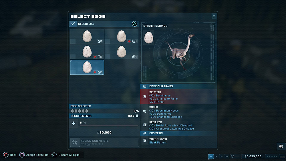 The process of hatching dinosaurs has also been vastly improved. This now takes place in two stages and allows you to select from a choice of embryos after checking out any potential issues, meaning you can hatch multiple dinos at once—a blessing when attempting to breed herds of herbivores who quickly become lonely. Finally, when ready for release, an option to immediately airlift your dinosaurs is available in JWE2, solving the first game problem of having to release dinosaurs then immediately tranquilize and airlift them around the park if you didn’t want enormous hatcheries attached to every paddock.