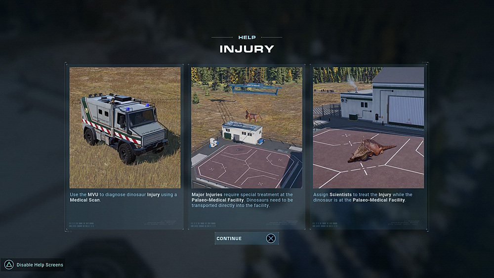 Jurassic World Evolution 2 (which I will now mostly refer to as JWE2) is rated ESRB Teen (for mild blood and violence) and PEGI 16 (for violence). Given this is a park simulation/management game, the violence found here is between the dinosaurs and when rampaging carnivores attack humans. There is also occasional sabotage where disgruntled employees and other groups will intentionally knock out park systems, leading to escaping dinosaurs and death/injury to humans. Injured dinosaurs will appear with noticeable red wounds, and you will occasionally find a dead dinosaur in your park.