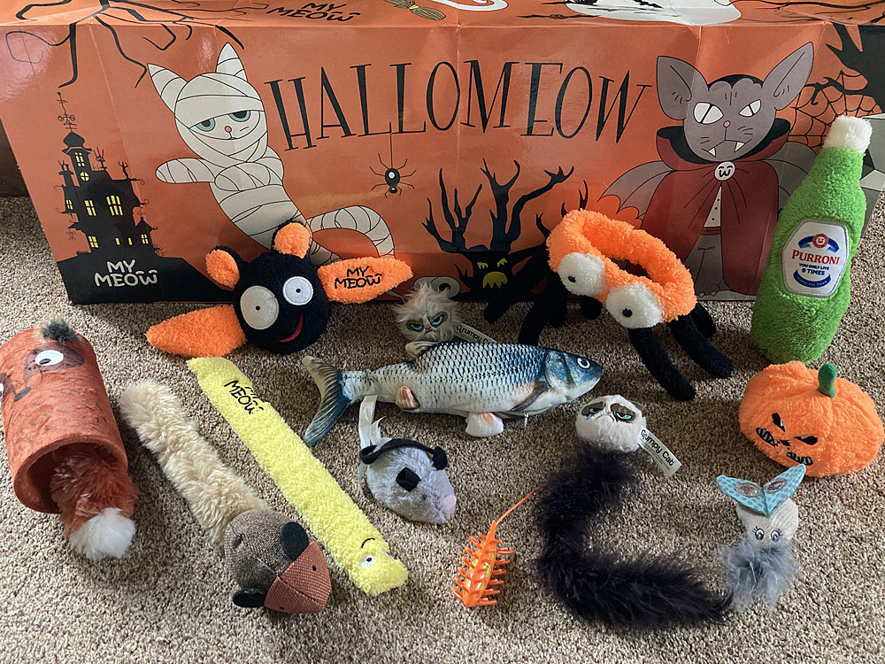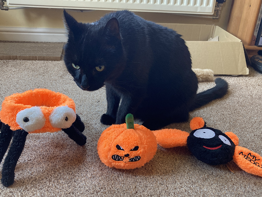 One thing I have found is that the number of cat toys in our house is now rapidly increasing! Once they have been out for a few days, the cats often lose their initial interest, so I have found myself considering putting some away to bring out periodically and keep things fresh. However, with the ongoing supply of new things every few weeks, I’m not sure when I would ever get around to actually bringing out some of the older items. We have a fairly large home, so the ever-growing pile of toys hasn’t been much of a problem, but for anyone living in a smaller environment such as a small apartment, you could quickly find your living space being overtaken by plush pumpkins and crinkly french fries. Many of the toys also make noises that can’t be shut off. One recent item was a strange feathery thing that made a very loud bird noise—not necessarily something you’d pick to have in your home if you don’t fancy being awoken by it at 3 am!
