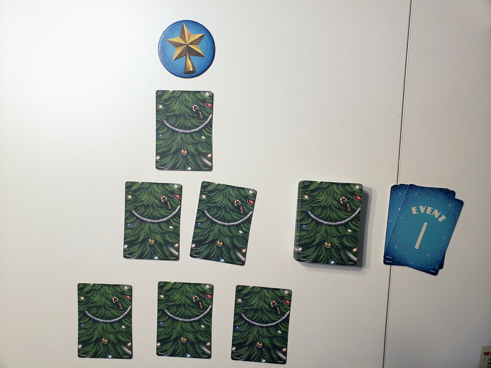 The cards are typical game card thickness, but the Treasure Cards versus the Event Cards are easy to differentiate. All the cards have lovely artwork with these childhood favorites featured. The Treasure Cards take things an extras step further, noting the combos needed and the point values at the bottom of the card and by adding symbols in the upper corner to indicate which combo type they are so that no one, especially younger players, has any doubts. The Star Token is a thick cardboard circle with a Star Logo on it. Combined with the face-down Treasure Cards, they get arranged into a Christmas Tree formation, which is extra fun. The Instruction Booklet is great at explaining rules, using diagrams and breaking things down so that you understand the gameplay within minutes. Overall, it’s a nicely put-together little card game.