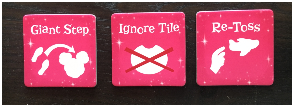 All players start behind cloud one, and through the course of the game you make your way around, flying from cloud to cloud, until you reach cloud eight. On the first cloud, you flip over the flight token and read it aloud. Following the directions, you each toss your flyer, making sure to leave it where it lands. After all players have gone, the closest flyer wins and scores the flight tile. The flight tile should be retrieved from the previous cloud and the winner of that round can then help the other players by placing a lift token onto the next cloud. Where flight tiles present challenges like tossing the plane over your head or without bending your elbows, the lift tokens enable those who didn’t win to either take a giant step closer to the next cloud, ignore the flight tile instructions, or take a second toss if they don’t like where their first landed.