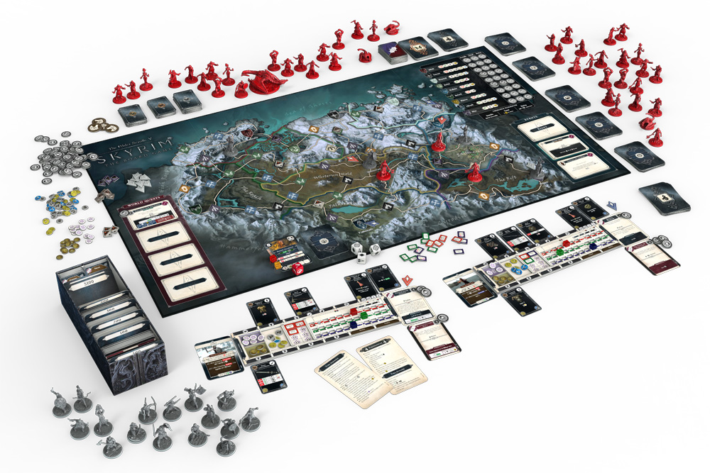 On each turn, you’ll draw Event Cards and attempts to complete Quests to claim rewards. You’ll be able to explore caves, mines, ruins, and even Dwemer Cities as you explore freely around the map. As you defeat classic in-game enemies like Draugr and frostbite spiders, you’ll earn treasure including armor, weapons, and potions, plus experience which will allow you to level up. As in the video game, you’ll be able to increase your Health, Stamina, and Magicka and build up your choice of skills including different schools of magic, combat, and others like Pickpocketing, Speech, and Block.