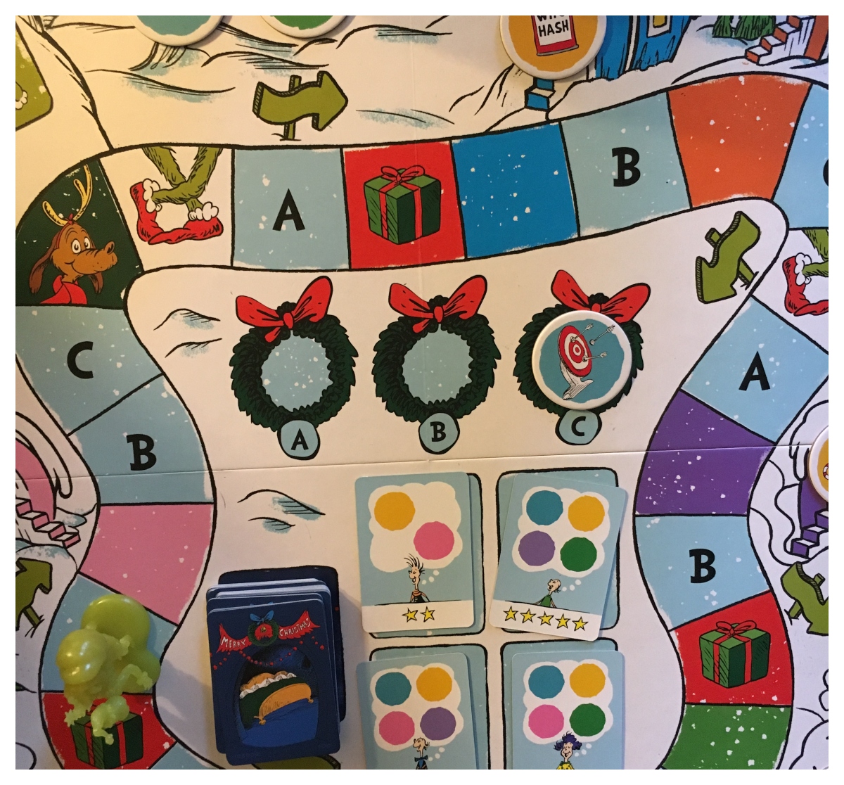 When all the spaces around the town center have been filled with eight completed wishes the game is over. You add up all the stars collected in the town center and if the team has as many or more than the Grinch then the townsfolk win and Christmas is joyous. If the Grinch wins, well we know how that ends.