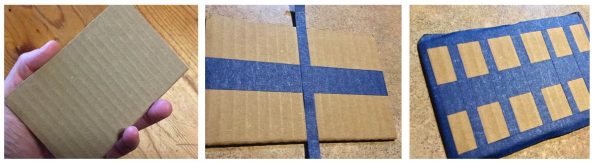 To make this activity, take an index card or other small piece of cardboard or cardstock. Use something thicker and sturdier than regular typing paper. Place a strip of masking or painter’s tape lengthwise down the middle, and then cross it with one perpendicularly in the middle. Add two more on each side of the shorter strip, and a little more tape around the “border” of the cardstock.