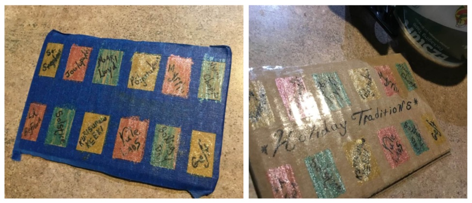 Each day, starting the day after Christmas, kids can use a coin or spoon to scratch off the square with the corresponding number 1 through 12. They can look up in a book or through an internet search engine the meaning of the word or the custom behind it. Later, it can be the topic of dinner or family time conversation for the day.