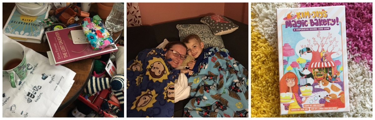 For me, the preparation is both parental and comfortable. I like to make sure my house is picked up a little more than usual. The table must be free of clutter for impromptu board gaming. We are sure to break out Winter Carcassonne and Exploding Minions in the next 24 hours. I fully expect to find time to play Kim Joy’s Magic Bakery as well. The kitchen should be as mess-free as possible so that I can sit and enjoy the falling snow instead of having to dig my way through dishes to make the necessary cocoa. Knowing the eating habits of my children, I will check the freezer and make sure the necessary products are defrosting. But practicalities aside, I make sure that I have enough yarn for my current project, and have choices if I change my mind. I also need to have my books ready.