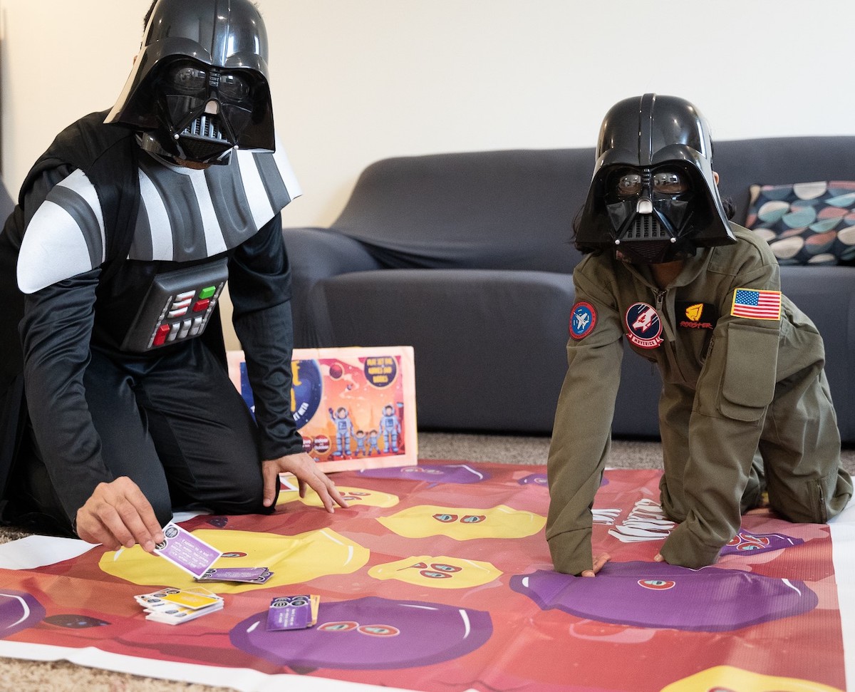 Space Gym is the brainchild of Sue, who created the game for her 6 year-old daughter to get her active while being engaged with space education. First, her daughter loved it. Sue made a few more sets for friends, who also loved it. Then she had 50 sets printed and, even at the height (depth?) of the epidemic, sold all those to other families looking for something new and fun.