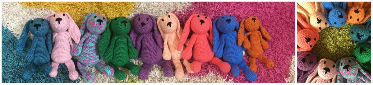 Emma the Bunny is one of the original patterns by UK designer Kerry Lord. It is a great starter pattern, a great palette cleanser between bigger projects, and as it turns out, thoroughly addicting when you start to see them line up.