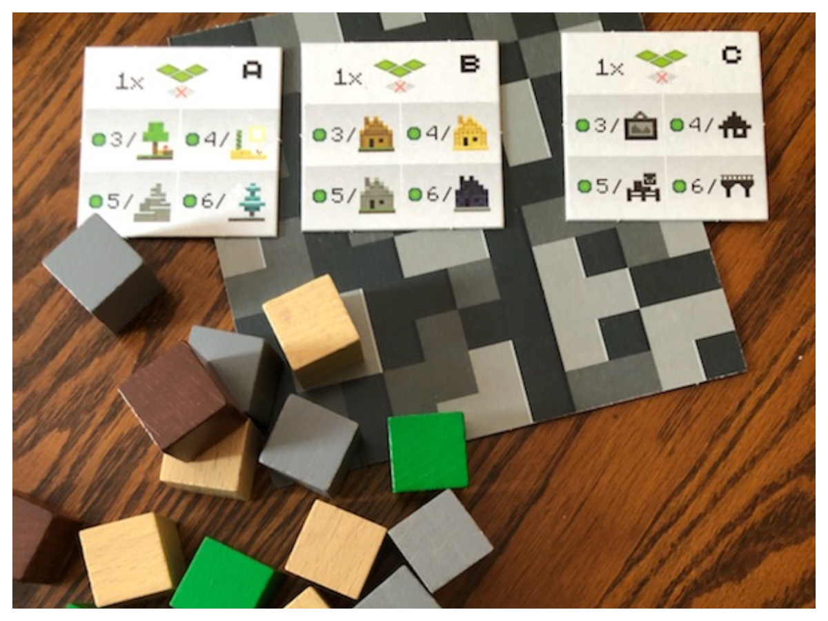 This brings me to the second thing I enjoyed immensely, and that is the construction of the game itself. Though I at times lamented the exclusion of some kind of game board for setup, I did enjoy the versatility of the card placement. The different types of cards, the artwork of the game the quality of the tiles, all heighten your enjoyment of the game. However it was the method of moving from one stage to the next that won me over. At the beginning of the game you erect a cube of wooden blocks, each representing a type of resource in the game. On your turn you may choose to take two of these blocks to help you achieve your goals. Then when the first level of blocks is gone, you score the first stage. When you get to the second level of blocks, well you can see where this is going. It kind of adds a Jenga-like quality to the game, and I really enjoyed to the tactile aspect of this otherwise card-based game.