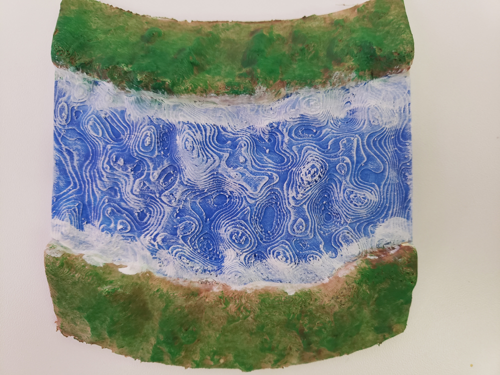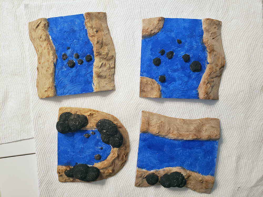 While my husband, J, tends to be the Head of Printing in our house, the painting end of things is where I tag in. When I envisioned what I wanted these pieces to look like, I liked the idea of the grass being on top of dirt, where you’d see more dirt along the banks with grass done in a way where you see those little dirt spaces peeking out like you would in a real-world nature situation. For my painting, I use primers and a variety of paints from the different Scale 75 lines. I primed in two colors from the Instant Color line, the off-white Bone Charm for anything not water and the white-based Holy Charm for the water. To pull off the look I wanted, I ended up watering down Bosh Chestnut from the Fantasy & Games line with one drop of paint to three drops of the Dispel Medium from the Instant Colors line. I then did the water Tesla Blue from the Scale Color line. For the rocks, I wanted to mix things up a bit and not just do a black rock with white dry brushing on the top mix. The rocks I did a base in Petroleum Grey from Scale color.