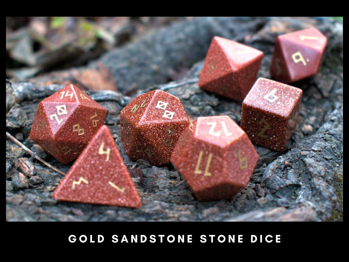The final set I checked out was the Gold Sandstone dice set ($84.99). These are the middle-ground dice in terms of weight. They have some weight, but I feel like the metal dice are a little heavier. Of the three sets, these are the hardest to read because of the gold glitter look. They are the smoothest though which makes them a winner in the sensory arena.
