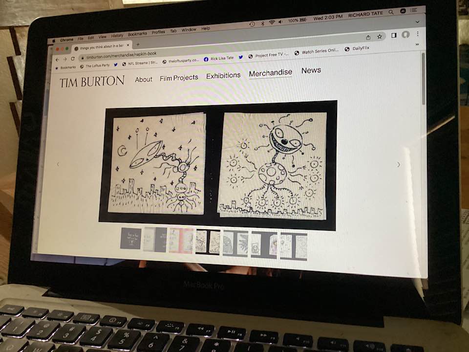 In fact, one of Burton’s art books, things you think about in a bar, is a collection of works he did completely on napkins primarily with simple ink pens.