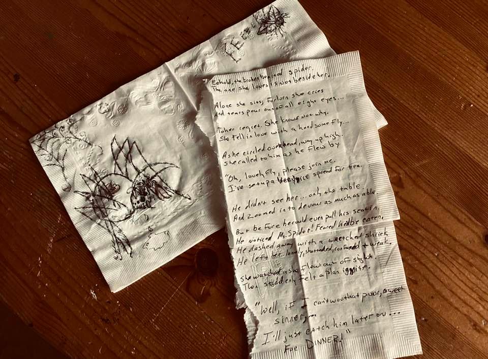 Burton also used his sketches for inspiration for his film projects, or to accompany his writings, as in his poetry collection The Melancholy Death of Oyster Boy and Other Stories. Write a short poem or description on the back of the napkin if you want to add to the world-building.