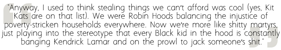 I’m going to start out this review by noting that as a white woman who lives in the English countryside, Alexis and Aamani’s lives are completely alien to me. The neighborhood they live in is the worst type of “hood” stereotype and this is something the author has acknowledged, stating that the fictional location of Hargrove is “a sometimes-exaggerated amalgamation” of the places he and his friends grew up and pointing out that not every block in the real world deals with those same problems. However, everything Alexis and Aamani go through is going on right now somewhere and the experiences of the kids living those lives need to be acknowledged, as does the systemic racism responsible for most of their hardships.