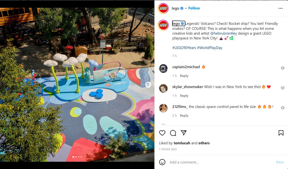 New York has gained its own giant LEGO playspace in the city, designed by artist Hebru Brantley, with a little help from some playful kids. Love the great use of street space with a volcano, a rocket ship and ‘friendly’ snakes. Check out this post shared by @LEGO on Instagram: