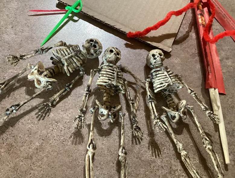 You will need more than one little jangly skeleton decoration (about 8″ tall), with good articulation in the hip and shoulder joints. Some of these you can find may also bend in the knees and elbow if you’re fortunate.