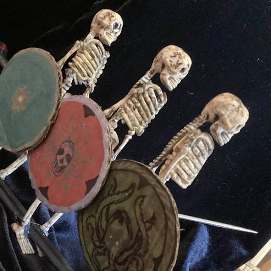 In one hand of each skeleton (it doesn’t matter which, as long as it’s on the same side for all of them), glue a little toothpick sword, you can leave them the bright colors they are or paint them silver, gold, or even a rusty brown.