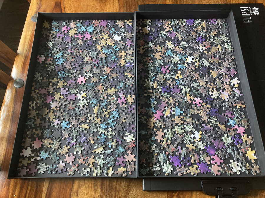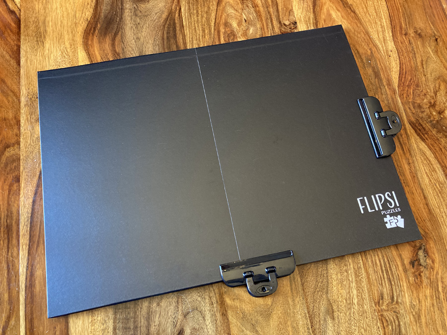 My set came packaged inside a study, black box large enough to hold all three puzzles, the Flipsi board, and the clips. The box is also large enough (just) to hold all your pieces spread out while you work on the puzzles, making it much easier to tidy them away quickly if you’re using a surface that needs to be available for other uses over the days you’re puzzling.