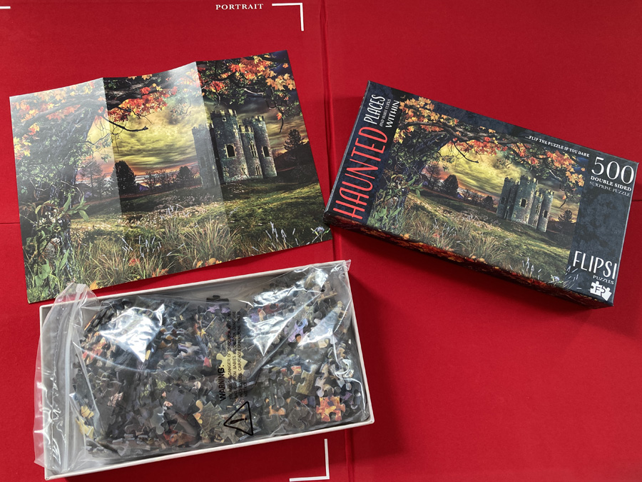 Within each of the three separate Haunted Places puzzle boxes, there was also a fold-out sheet with a printed image of the first side of the puzzle, and the pieces themselves came inside resealable plastic bags to help prevent pieces from getting lost.