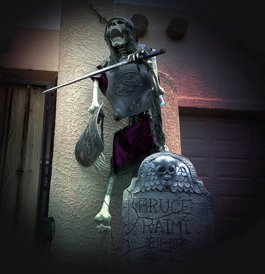 I used some solar spotlights of different colors to illuminate the grave and Deadite at night. This way, he can look good all night guarding our house or welcoming guests.