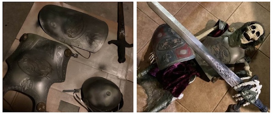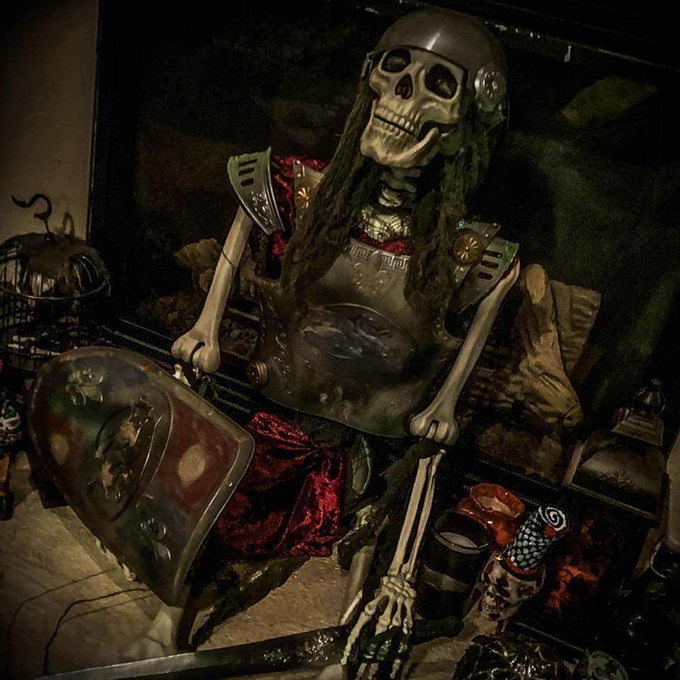 I used kids’ armor. My poor skeleton was a couple of inches shorter than me when he was standing, so I knew any big costume armor would swallow him up. I found a $20 set of kids’ armor with a helmet, chest plate, shield, and sword. These plastic pieces look as cheap as they are, so I aged them up a bit with some spray paint and acrylic paint. After that, they looked a lot more aged and beat up.