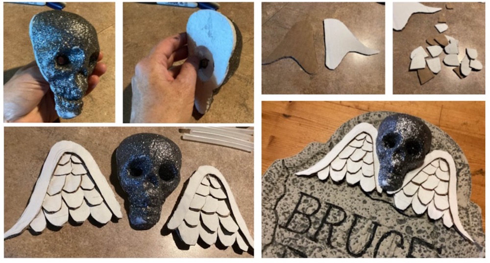 For the ornamental design on the top of the grave, I found a small styrofoam skull and cut it in half. I used corrugated cardboard to make a set of wings with a similar method I used to make some plague doctor staff wings I created two Halloweens ago. I just adjusted the wing shape a little to look more like the design on the grave.