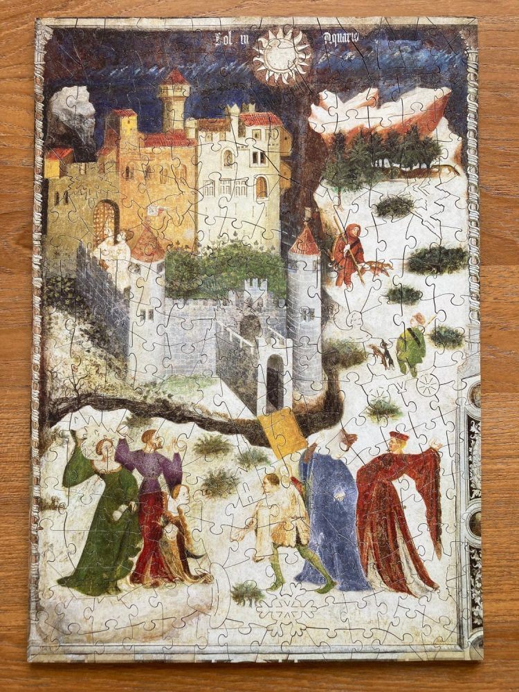 Because these puzzles have fun object shapes, I made a search-and-find puzzle for you to locate the special pieces in one of the puzzles they sent me. It’s probably my favorite of the group: January (Snowball Fight at the Castle Stenico). (And, if you like snowball fights in classic art, here’s a great article from The Public Domain Review.) Examine the completed puzzle above, and find these special whimsy pieces located within.