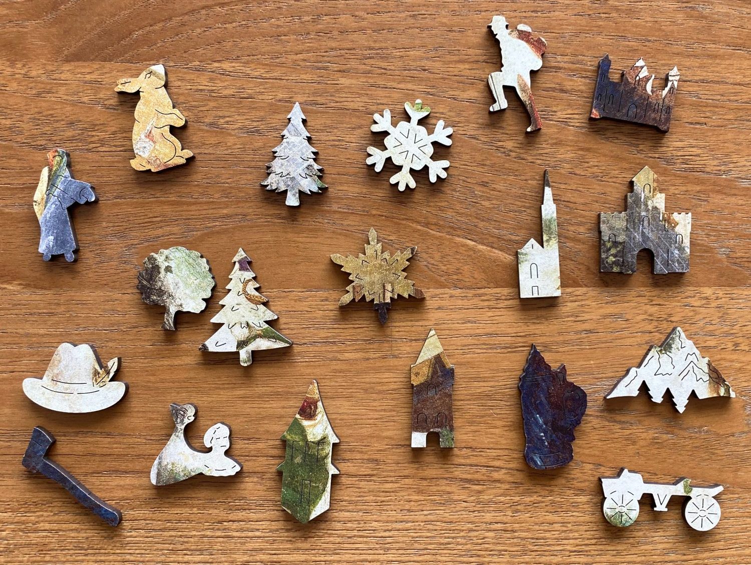 Though any set you receive will be fun and worth the money (despite most of these not being impulse buys), this year, the puzzles I received were thicker—4mm thick instead of 3mm—and the special, unusually shaped pieces were more interesting and even more varied. Each puzzle includes a generous portion of whimsy pieces—such as Christmas and other trees, themed items matching the puzzle theme, snowflakes, and more, with larger puzzles having different whimsy pieces than smaller ones—but even the “regular” pieces came in more shapes than I remember there being last year. Even when the pieces could just be the standard sort-of-rectangle shape, Wentworth seemed to go out of their way to make interesting shapes like triangles and wedges, long and thin pieces, and tricky “I’m totally not an edge piece” edge pieces. That added to the fun, difficulty, and mystery of these puzzles. My family tends to collect together the edge pieces first, building the frame and then filling in the middle. But we always ended up erring on the side of collecting too few or too many pieces for the edges, training us to doubt our judgment (in a fun way) for what pieces went where.